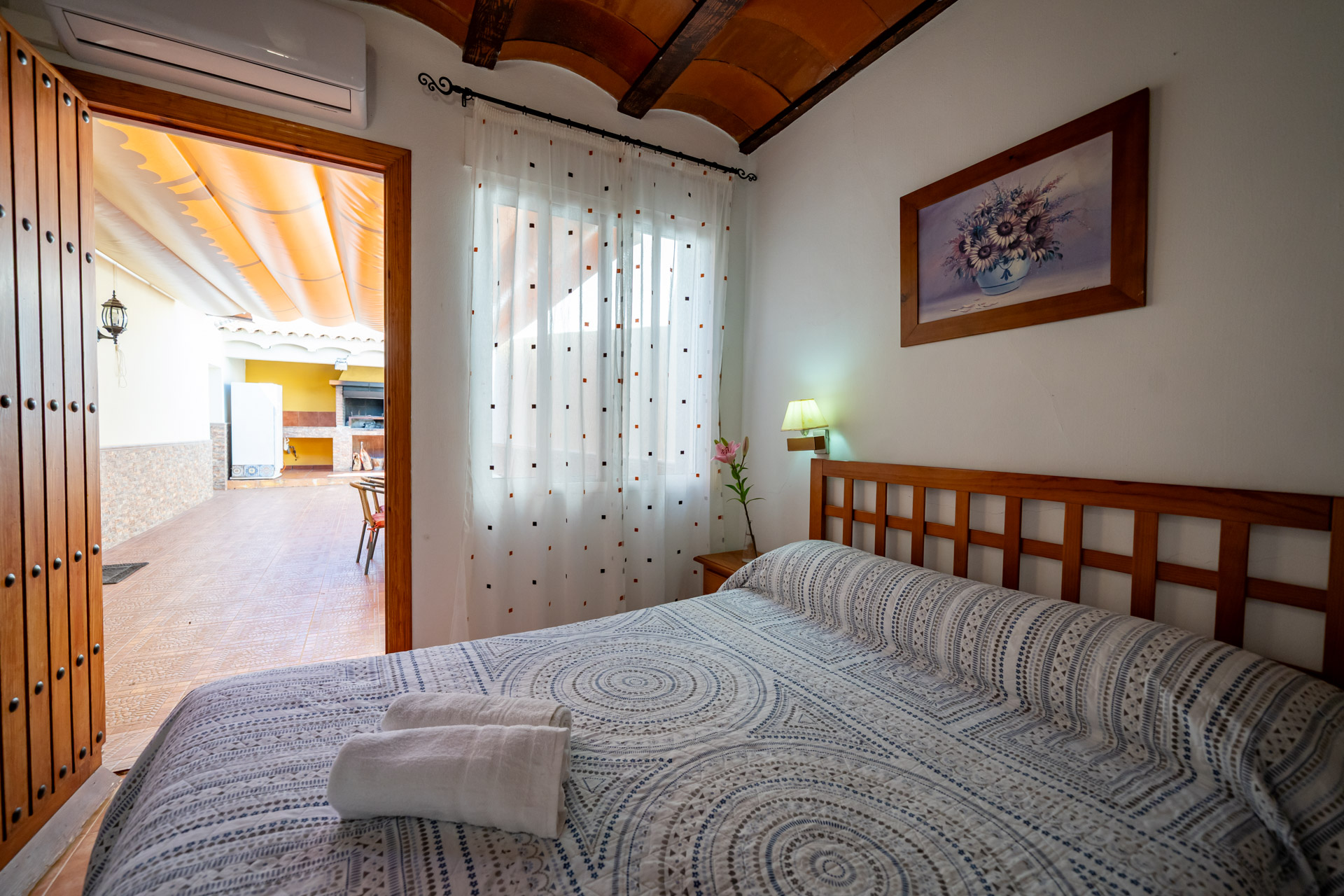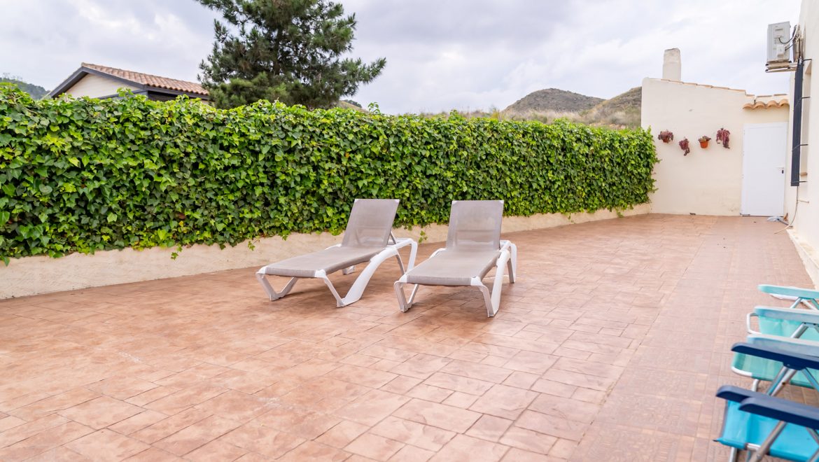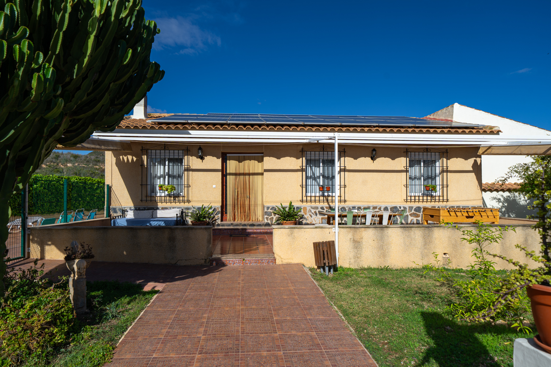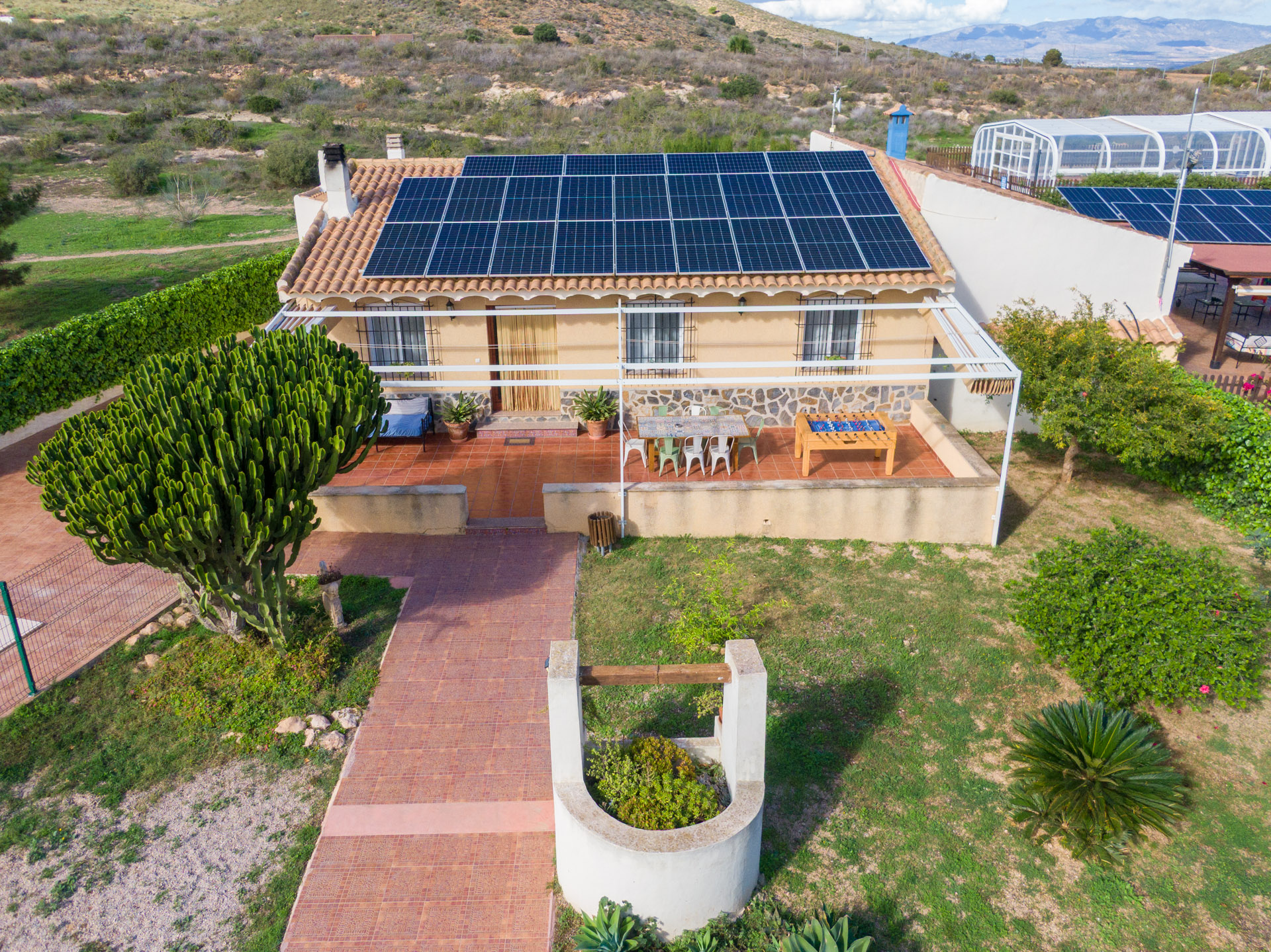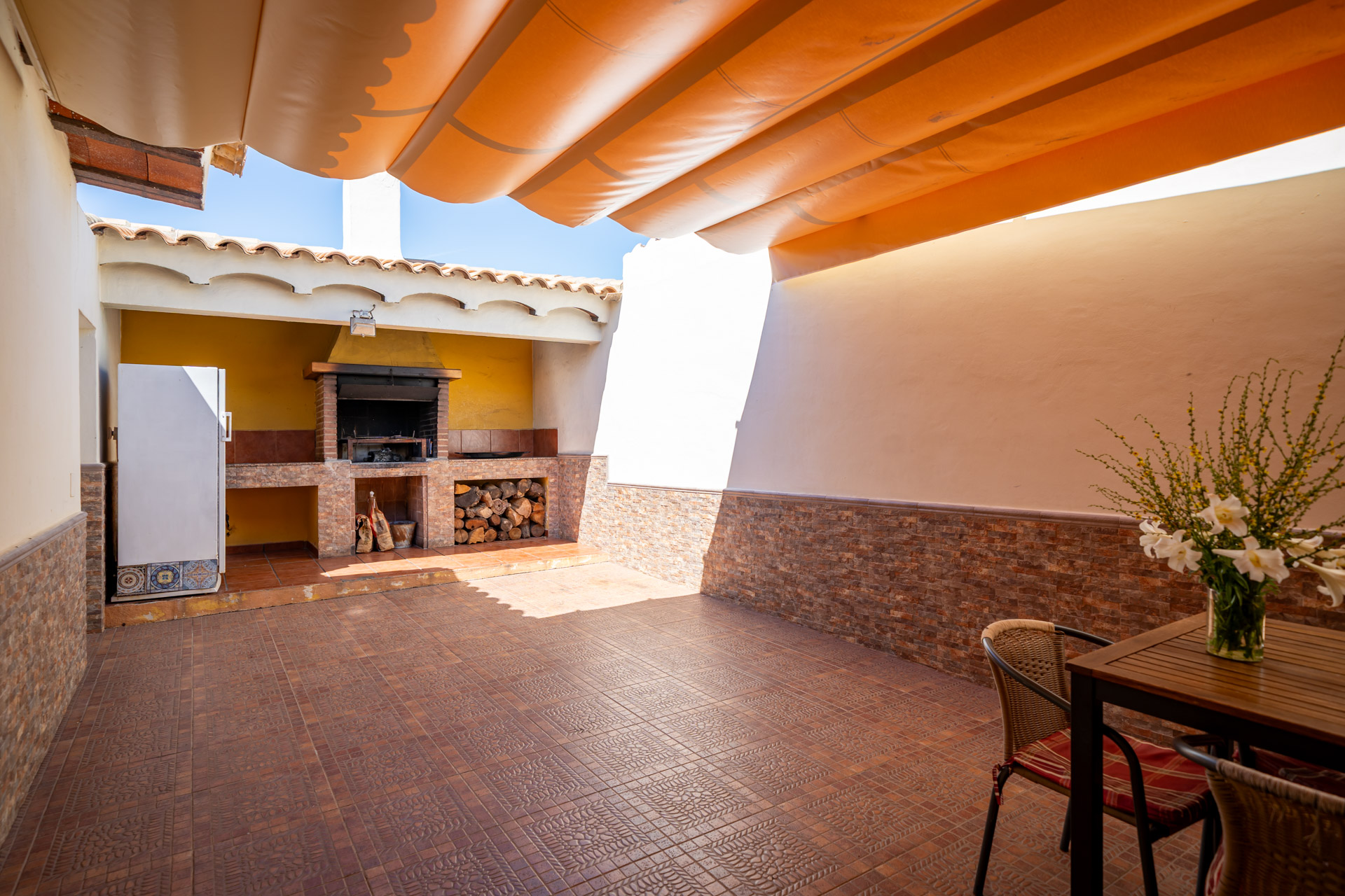 - Patio con toldo, con mesa y sillas para 4 personas, barbacoa con encimera, fregador, iluminación y punto de luz