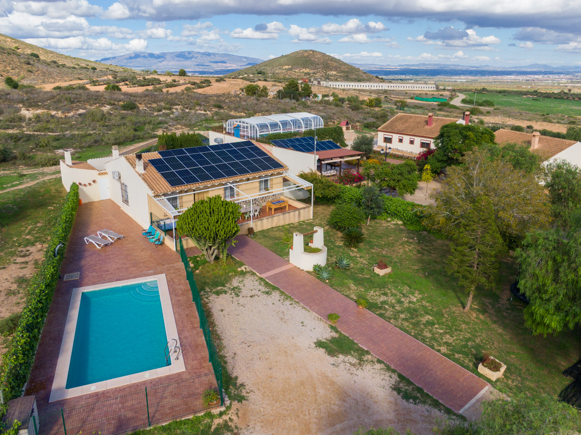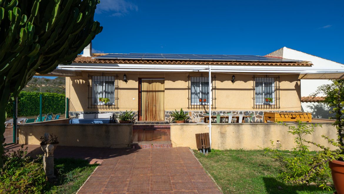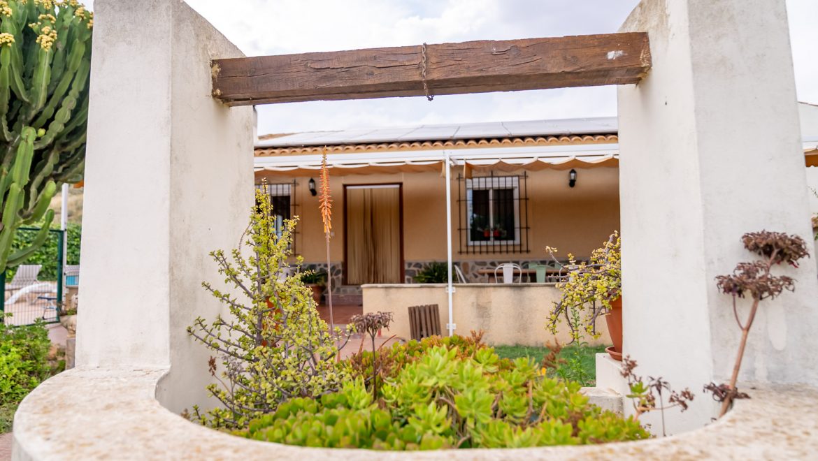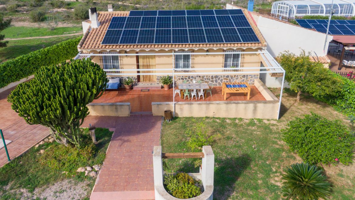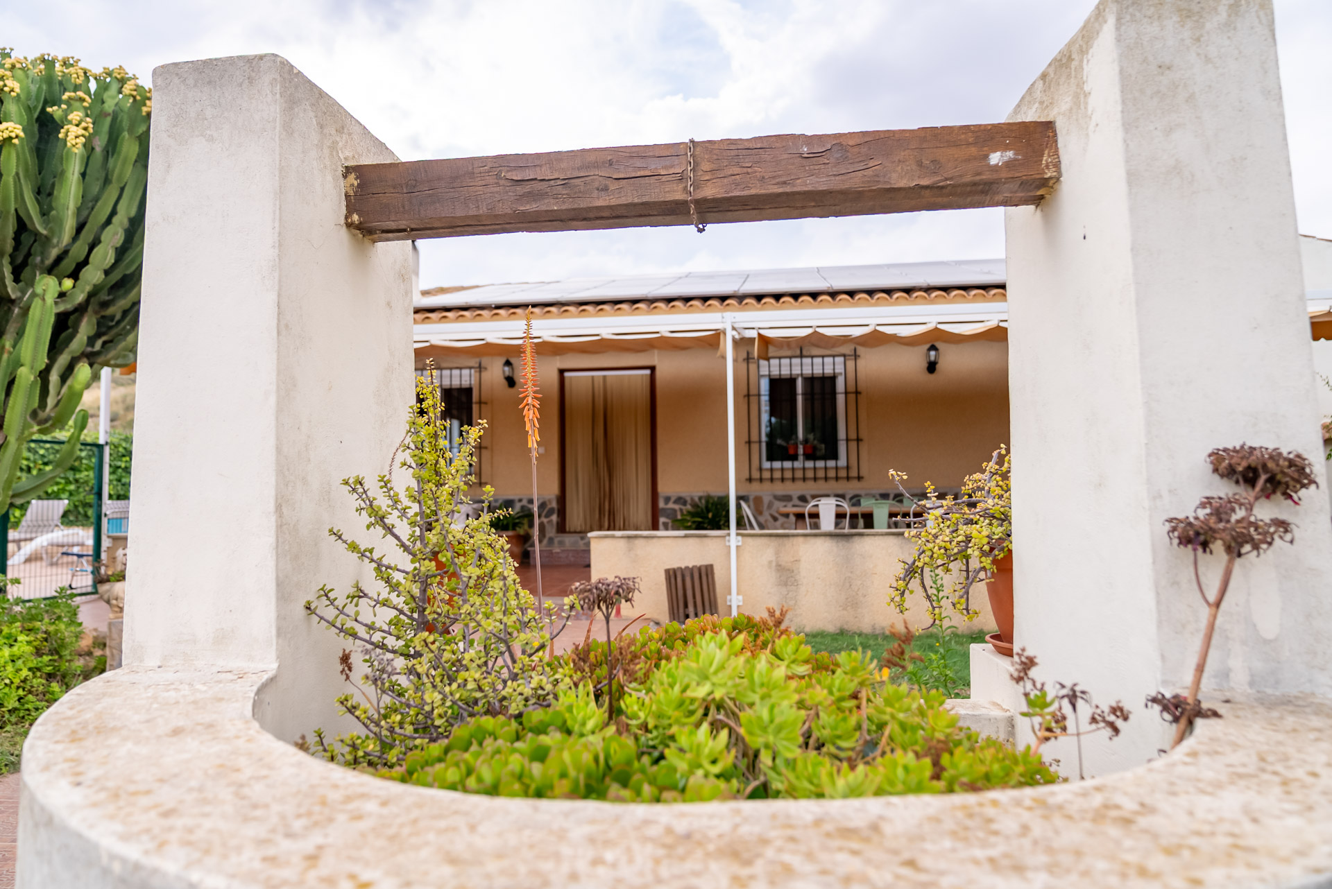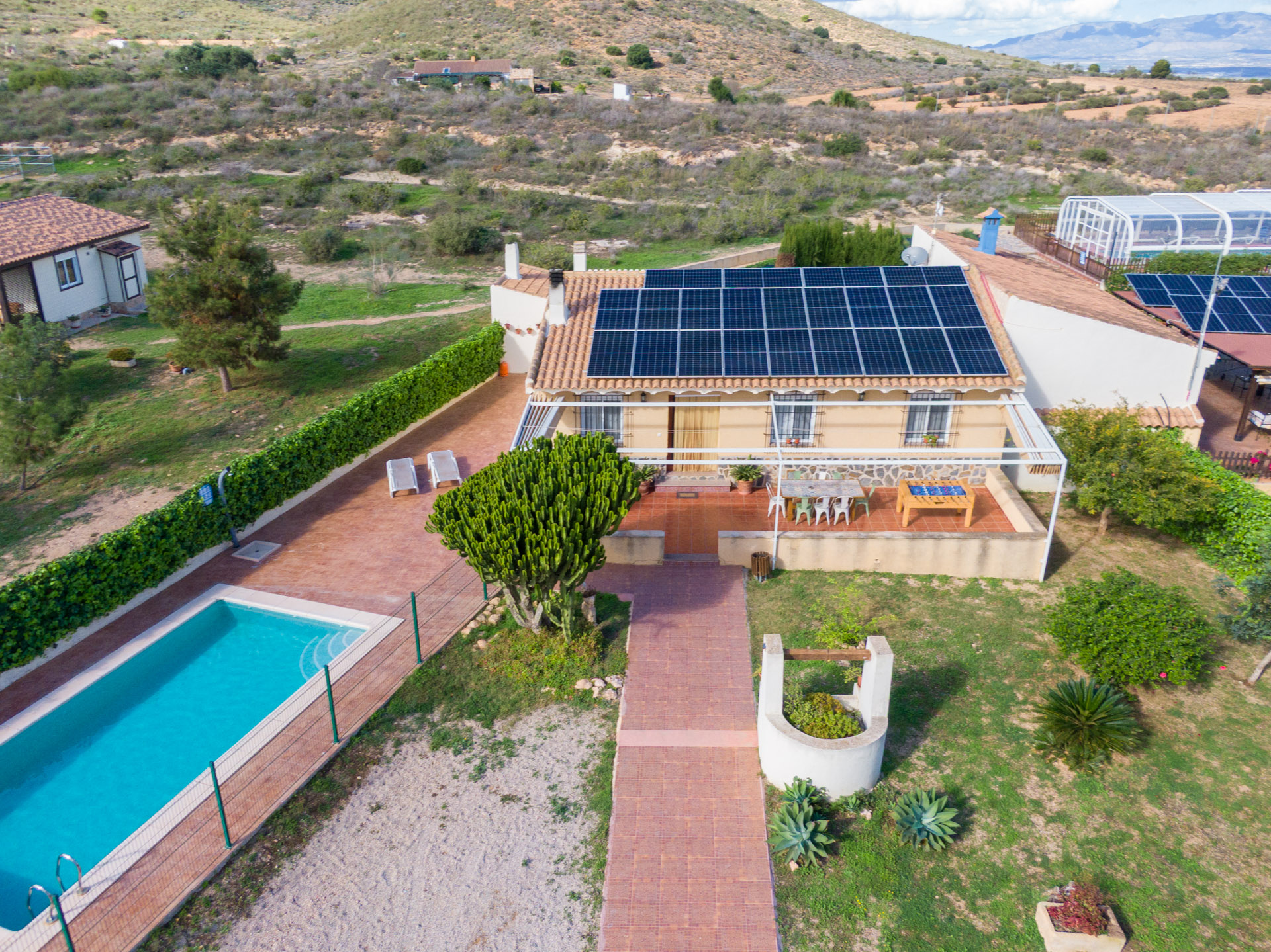- Patio con toldo, con mesa y sillas para 4 personas, barbacoa con encimera, fregador, iluminación y punto de luz