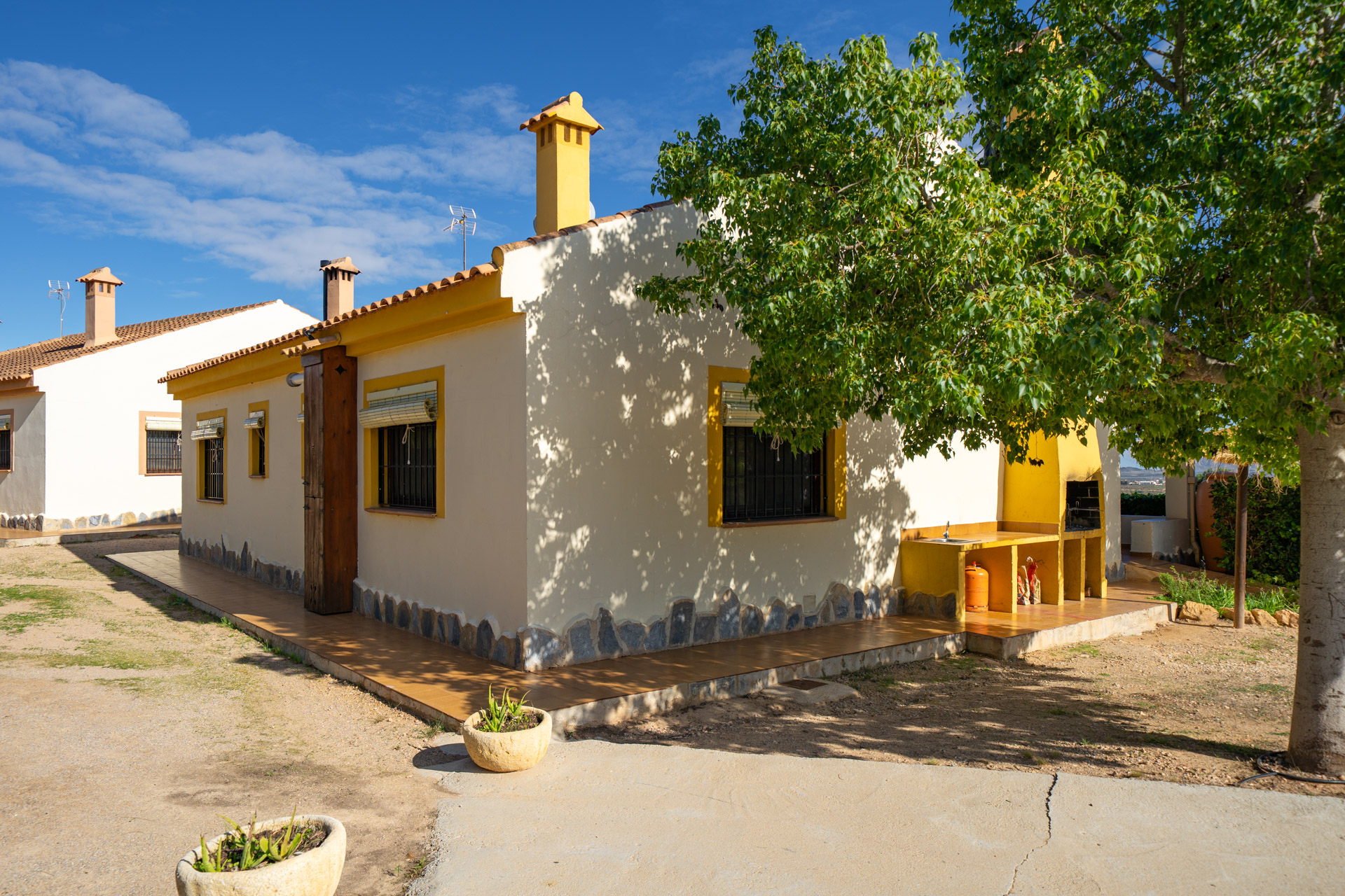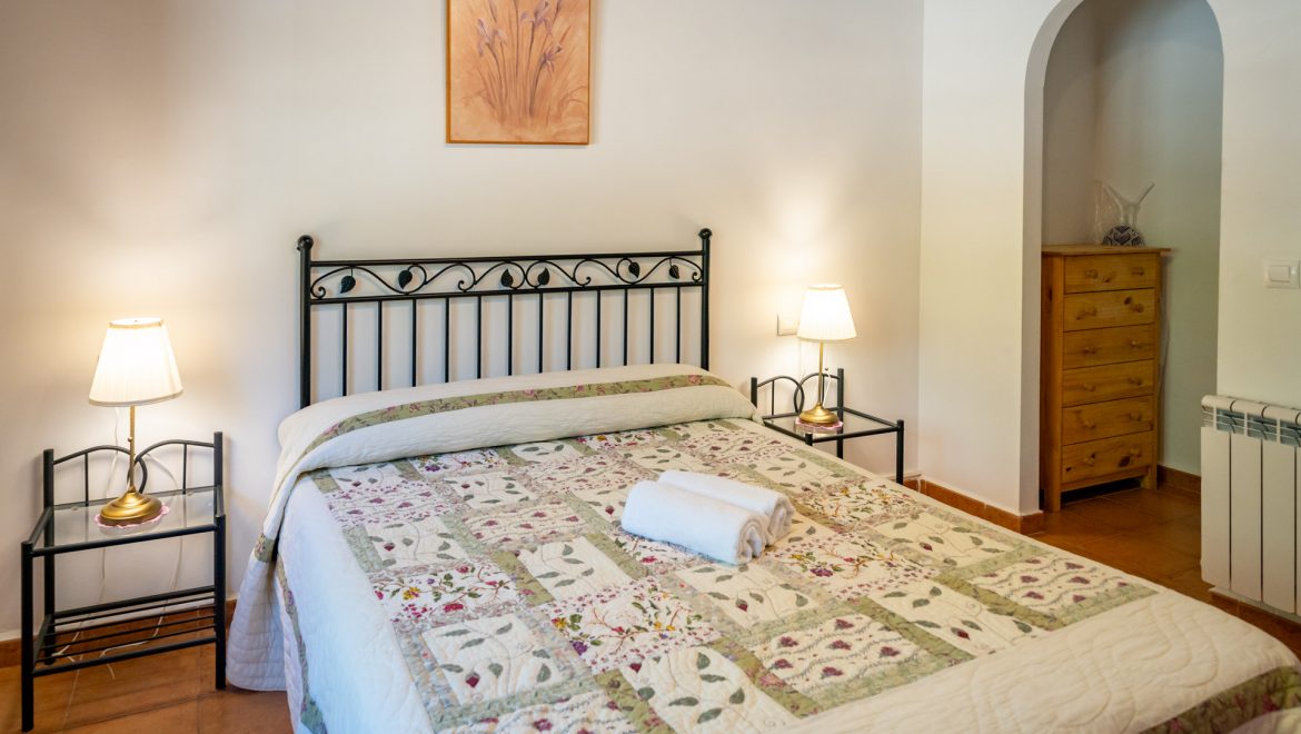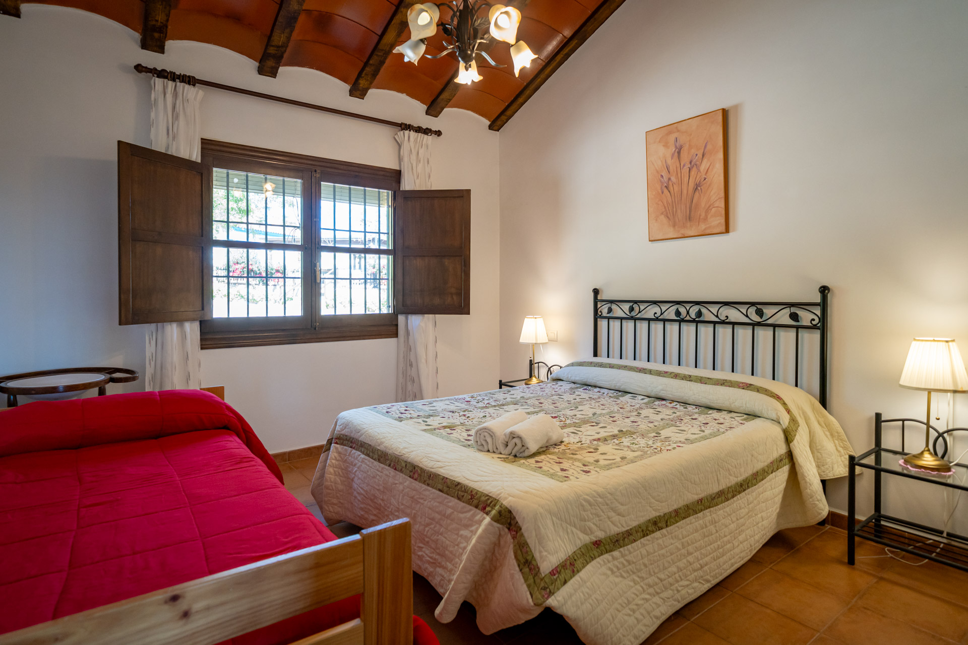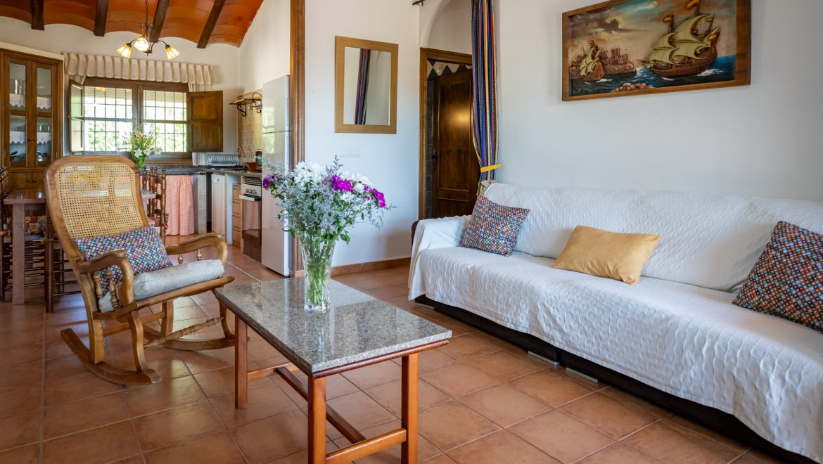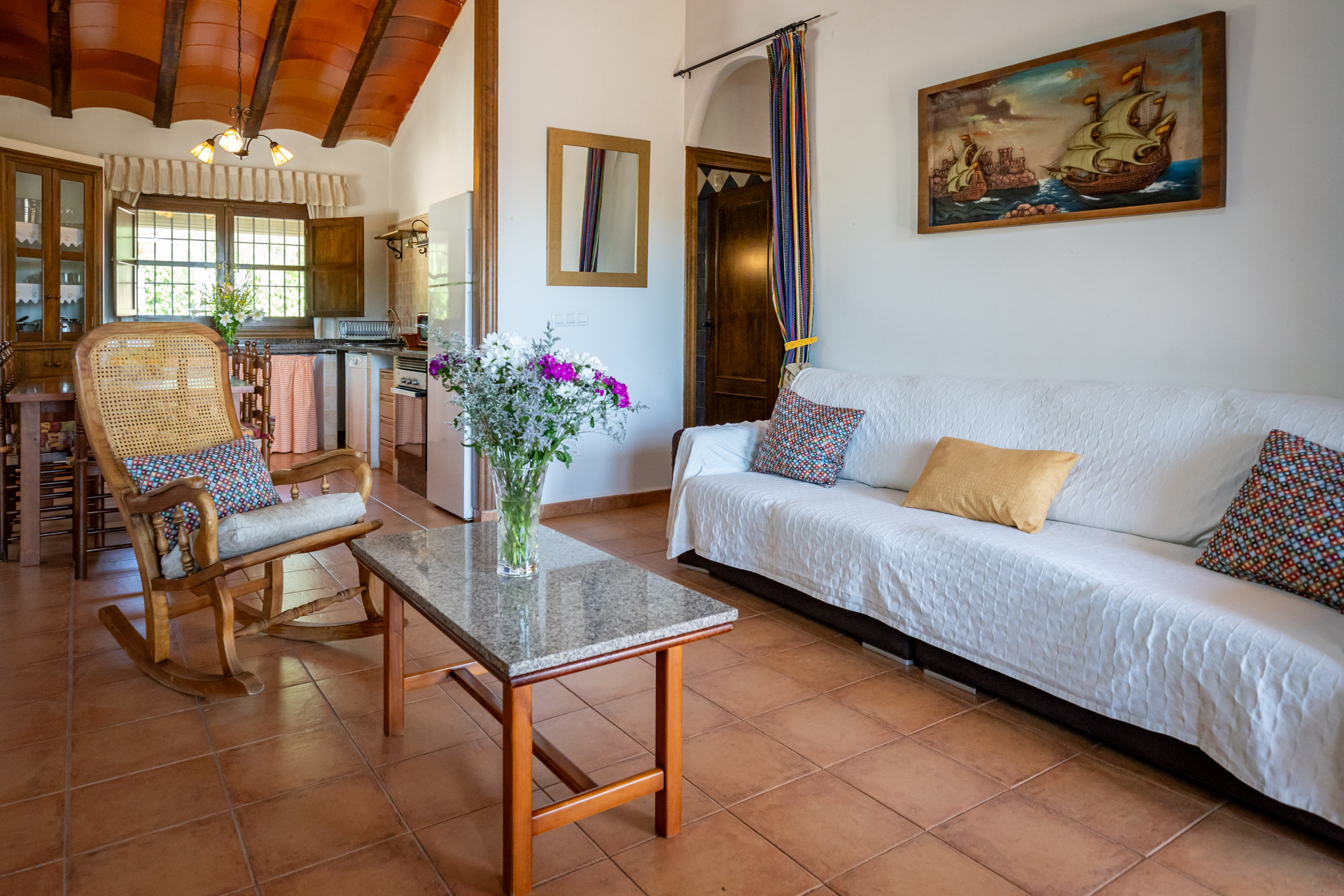 Tiene un amplio salón unido a la cocina, un dormitorio de matrimonio y dos dormitorios dobles con muebles de madera y forja, dos baños con ducha y bañera respectivamente, una terraza cubierta con muebles de jardín y junto a ella una zona ajardinada donde se encuentra la barbacoa. La casa está adaptada para personas con discapacidad.