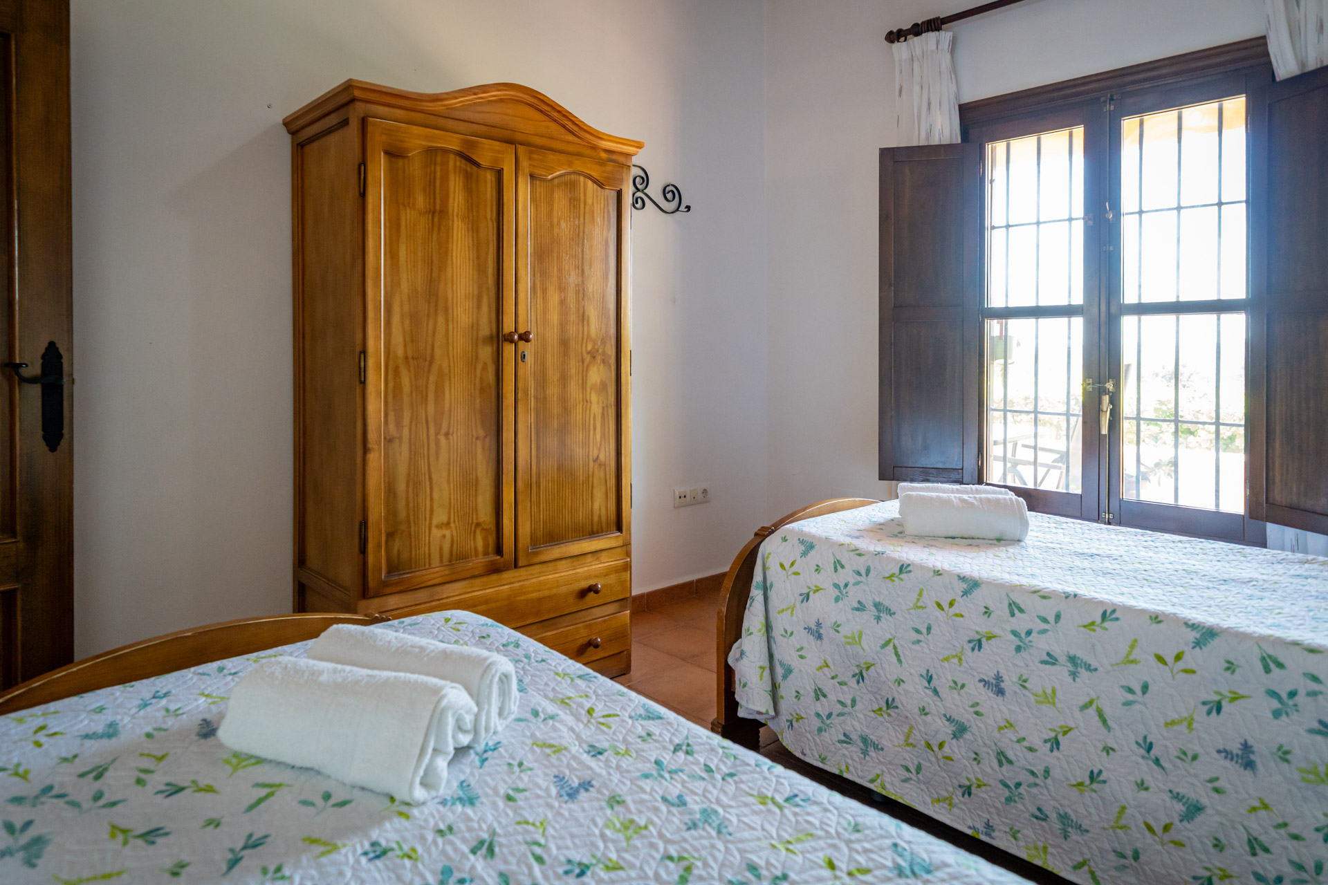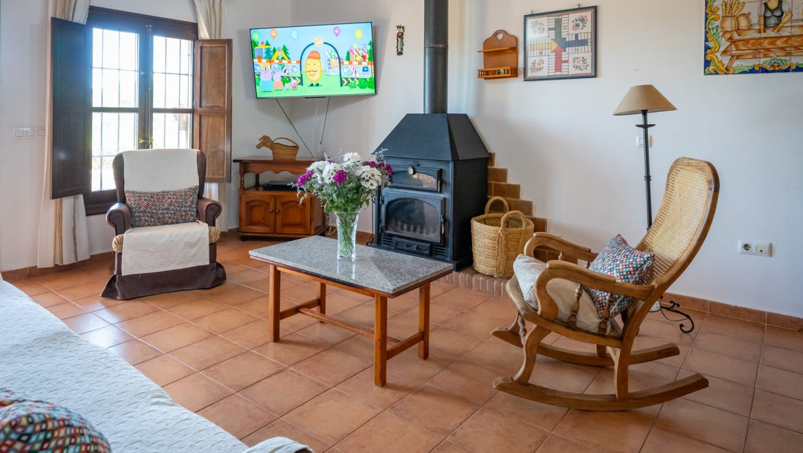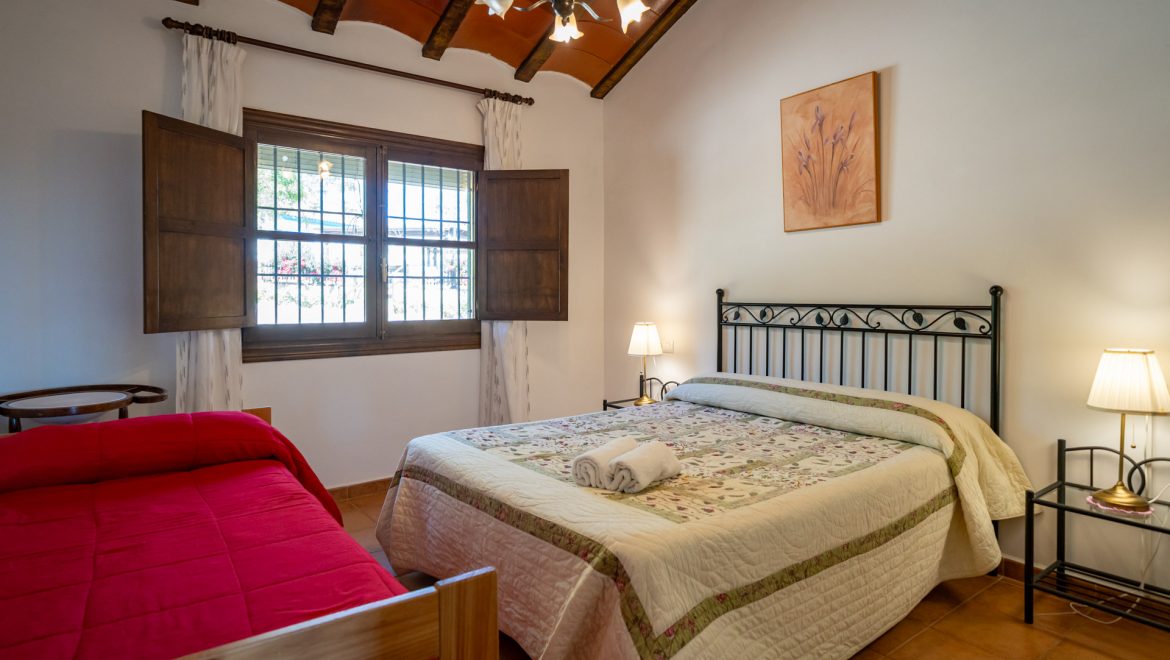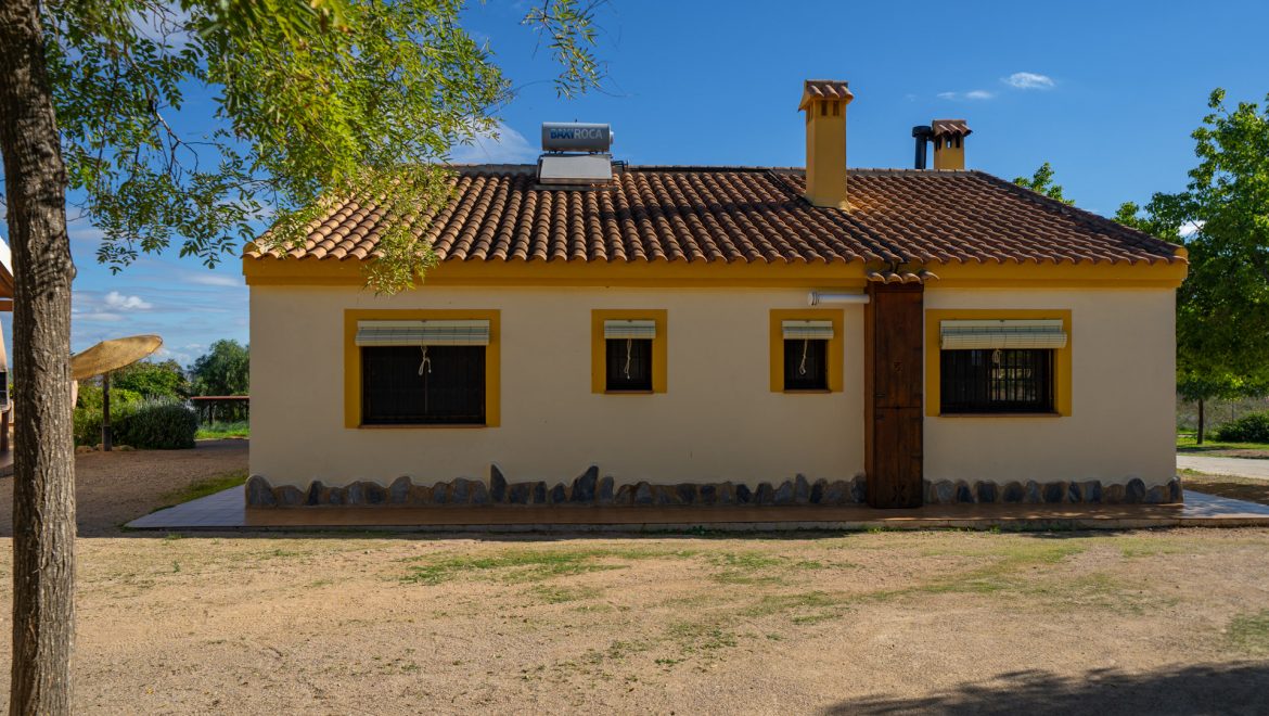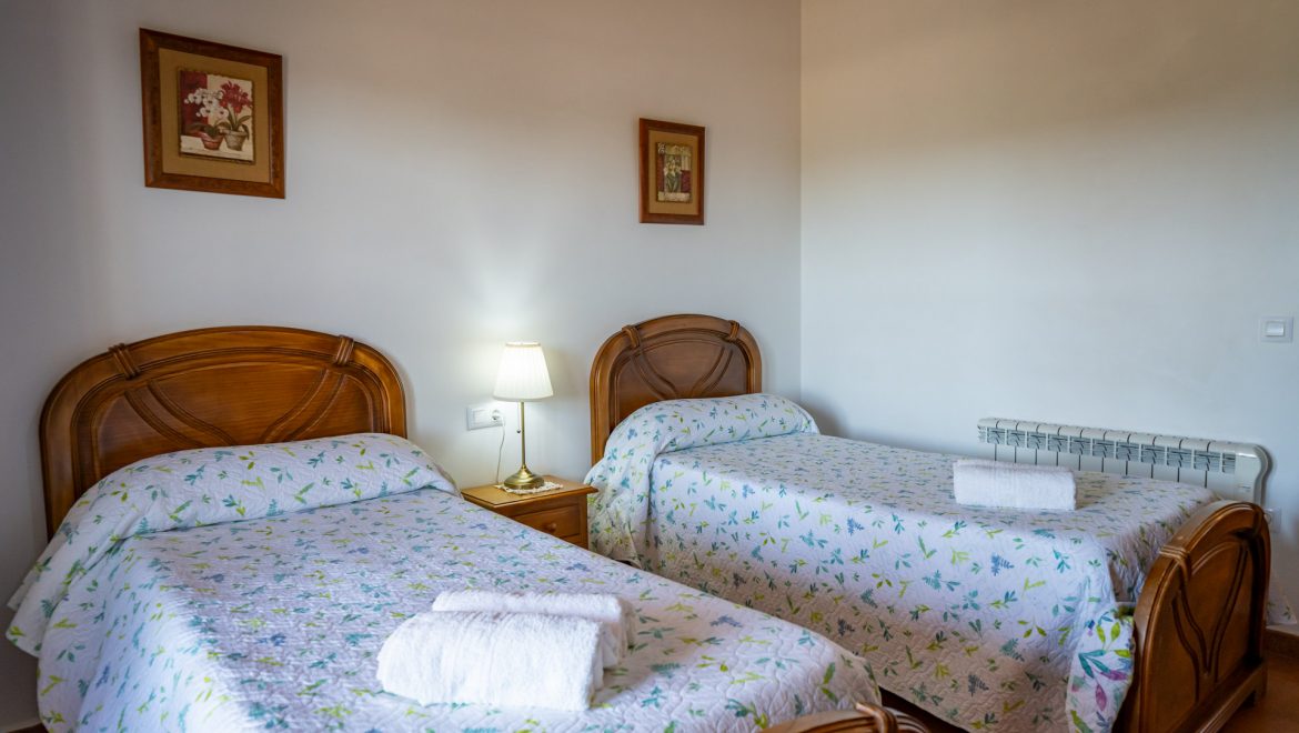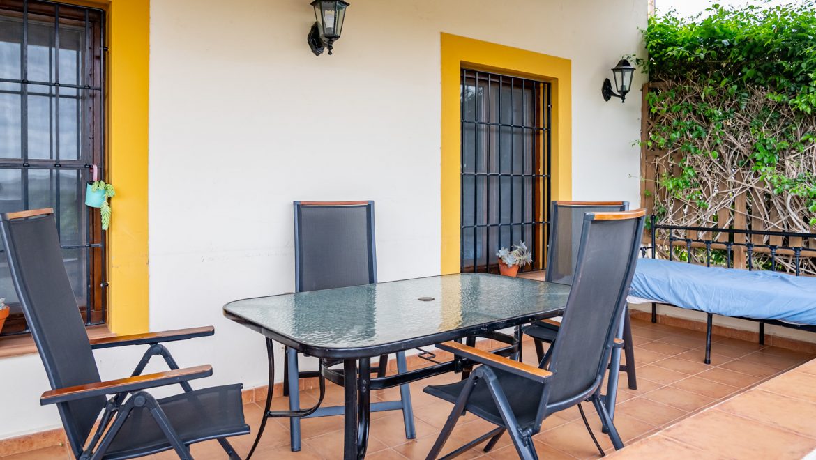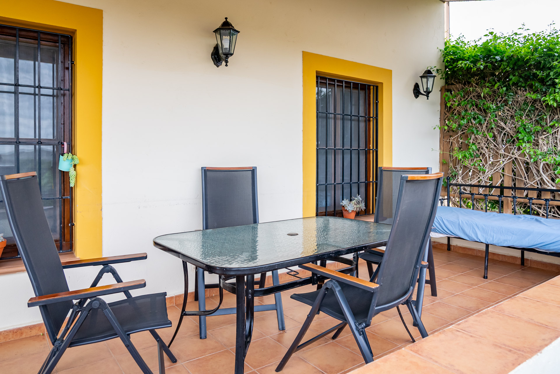 Tiene un amplio salón unido a la cocina, un dormitorio de matrimonio y dos dormitorios dobles con muebles de madera y forja, dos baños con ducha y bañera respectivamente, una terraza cubierta con muebles de jardín y junto a ella una zona ajardinada donde se encuentra la barbacoa. La casa está adaptada para personas con discapacidad.