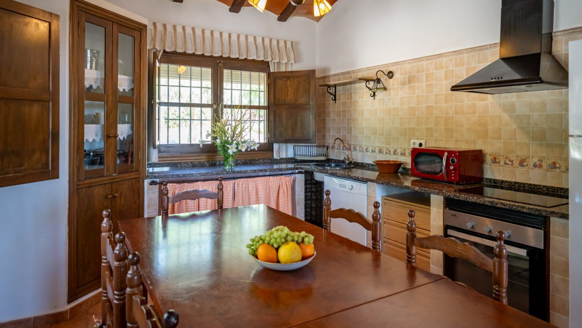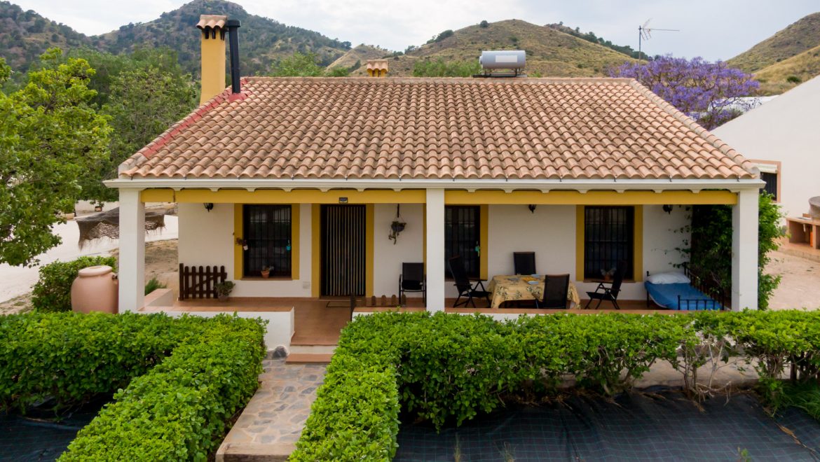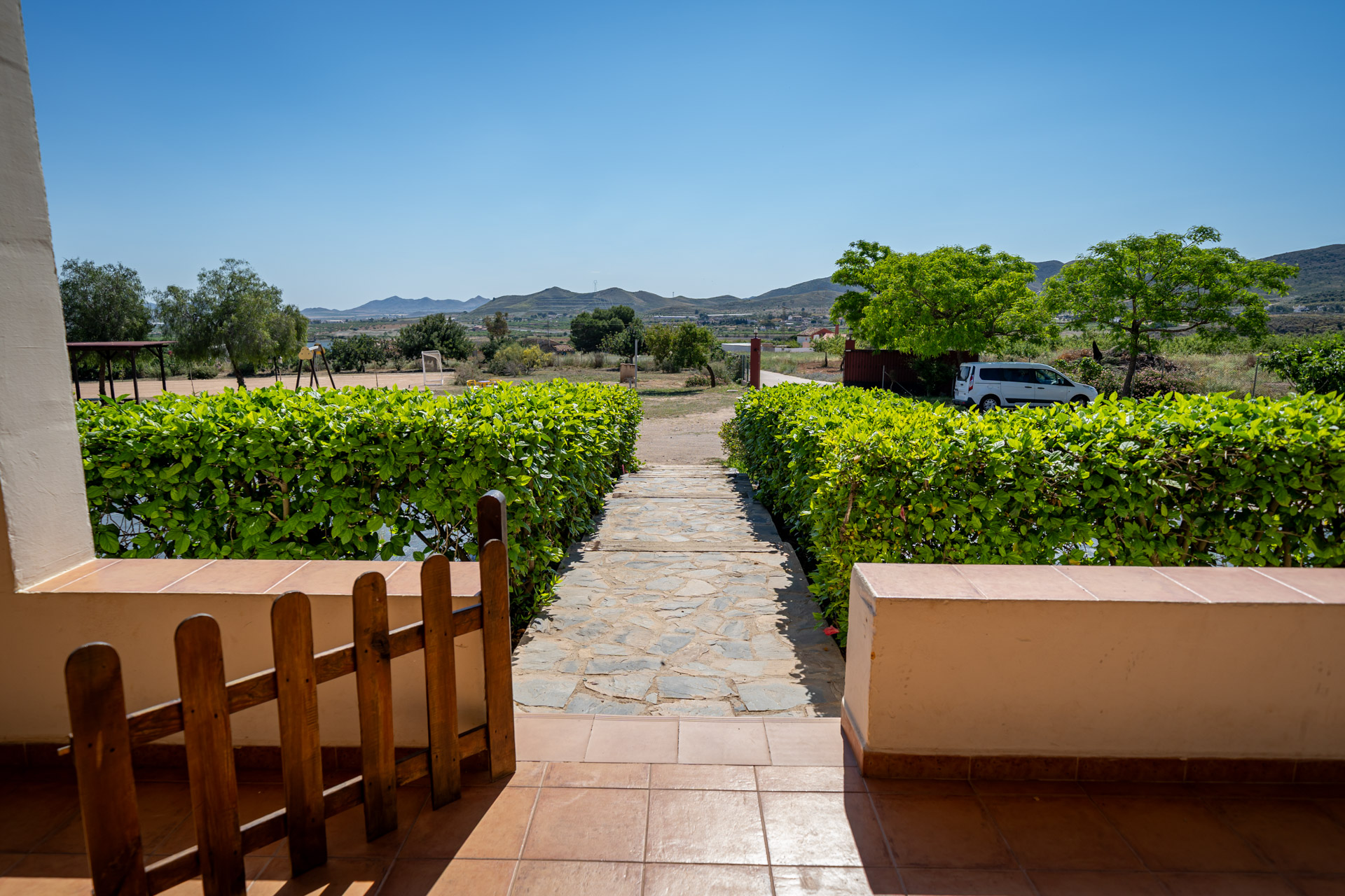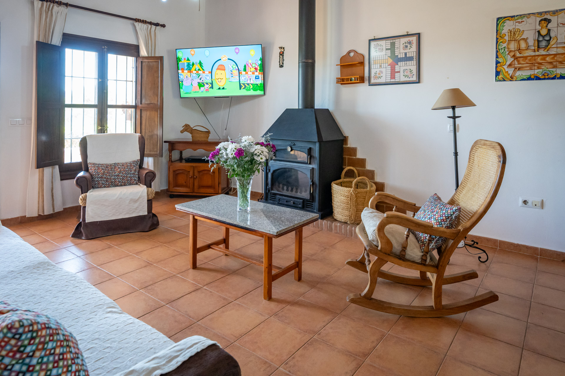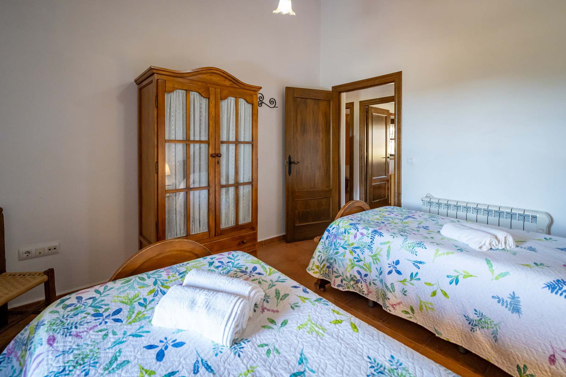 Tiene un amplio salón unido a la cocina, un dormitorio de matrimonio y dos dormitorios dobles con muebles de madera y forja, dos baños con ducha y bañera respectivamente, una terraza cubierta con muebles de jardín y junto a ella una zona ajardinada donde se encuentra la barbacoa. La casa está adaptada para personas con discapacidad.