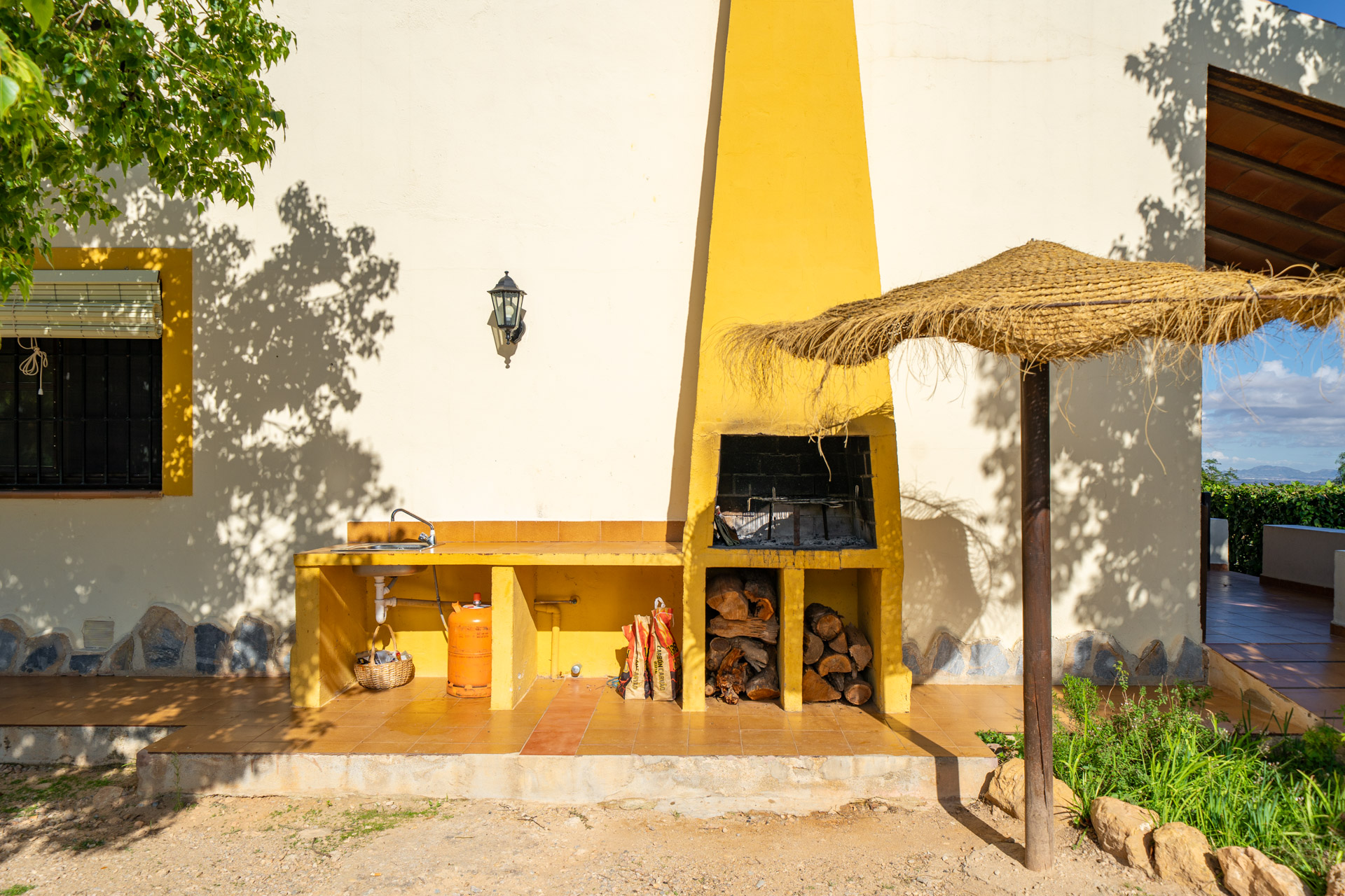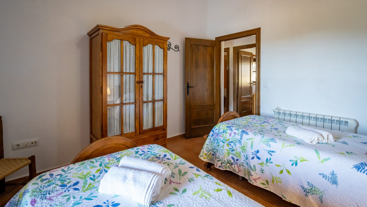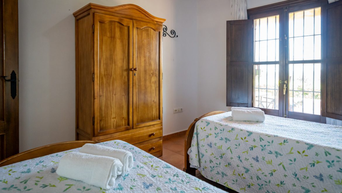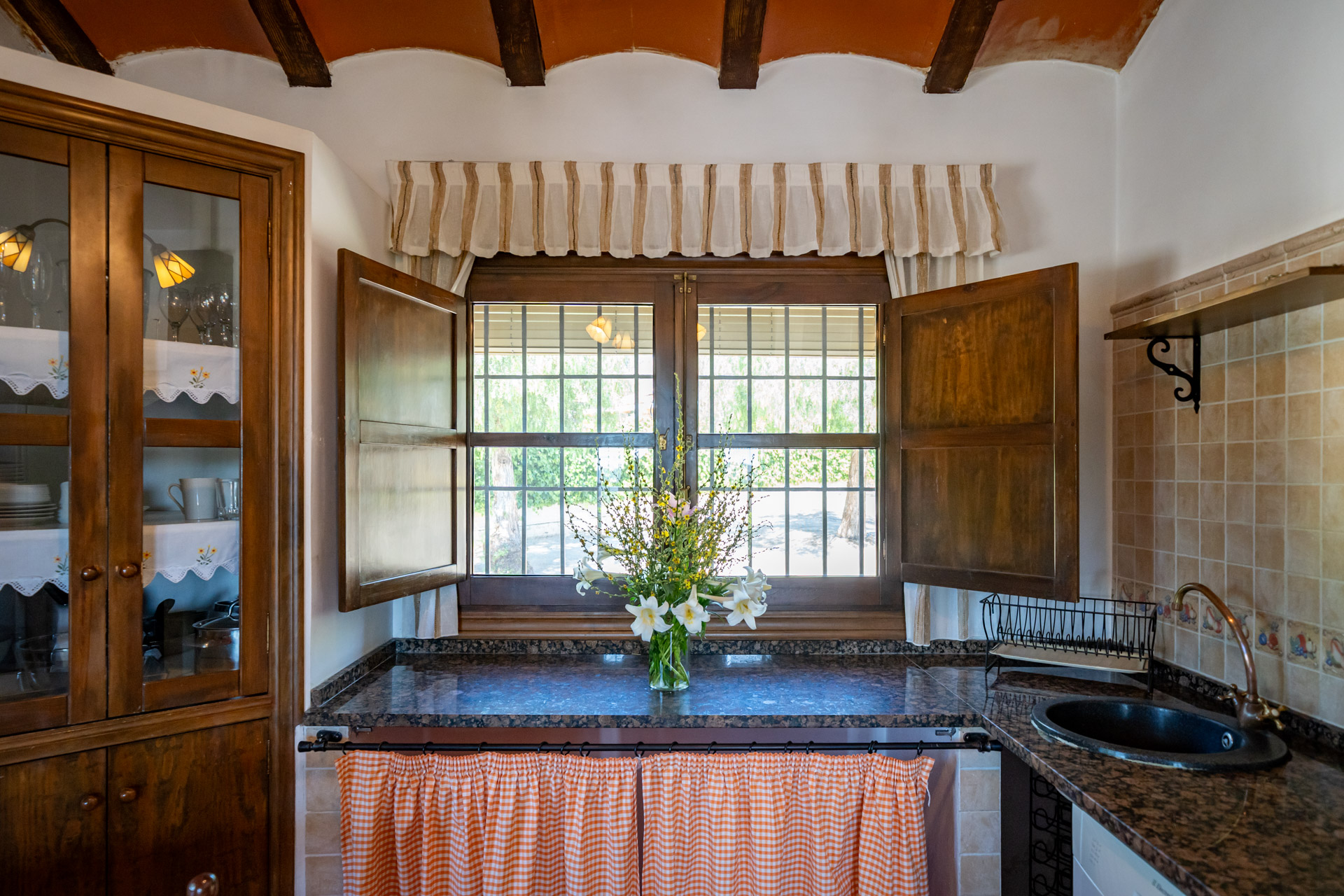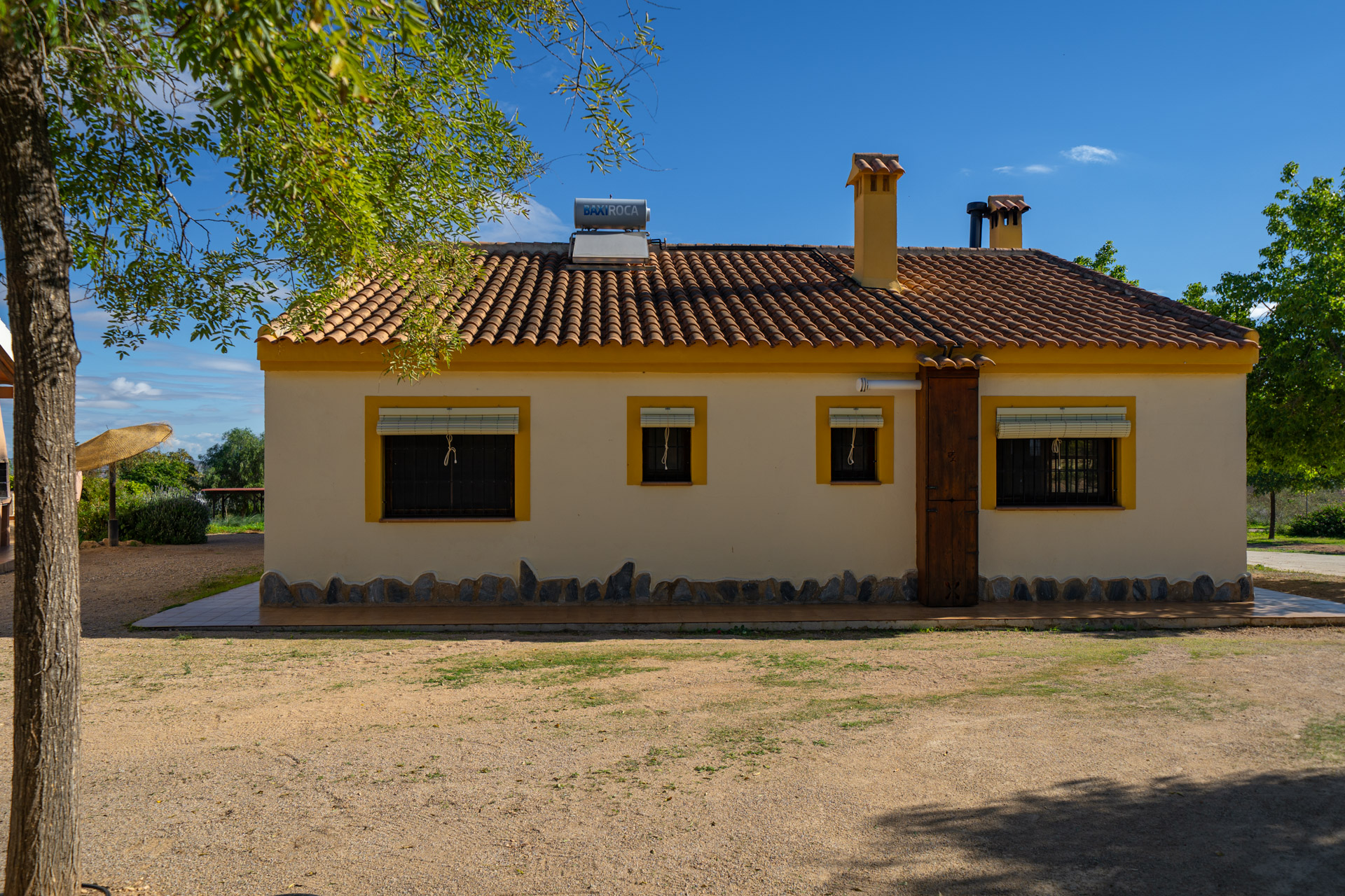 Tiene un amplio salón unido a la cocina, un dormitorio de matrimonio y dos dormitorios dobles con muebles de madera y forja, dos baños con ducha y bañera respectivamente, una terraza cubierta con muebles de jardín y junto a ella una zona ajardinada donde se encuentra la barbacoa. La casa está adaptada para personas con discapacidad.