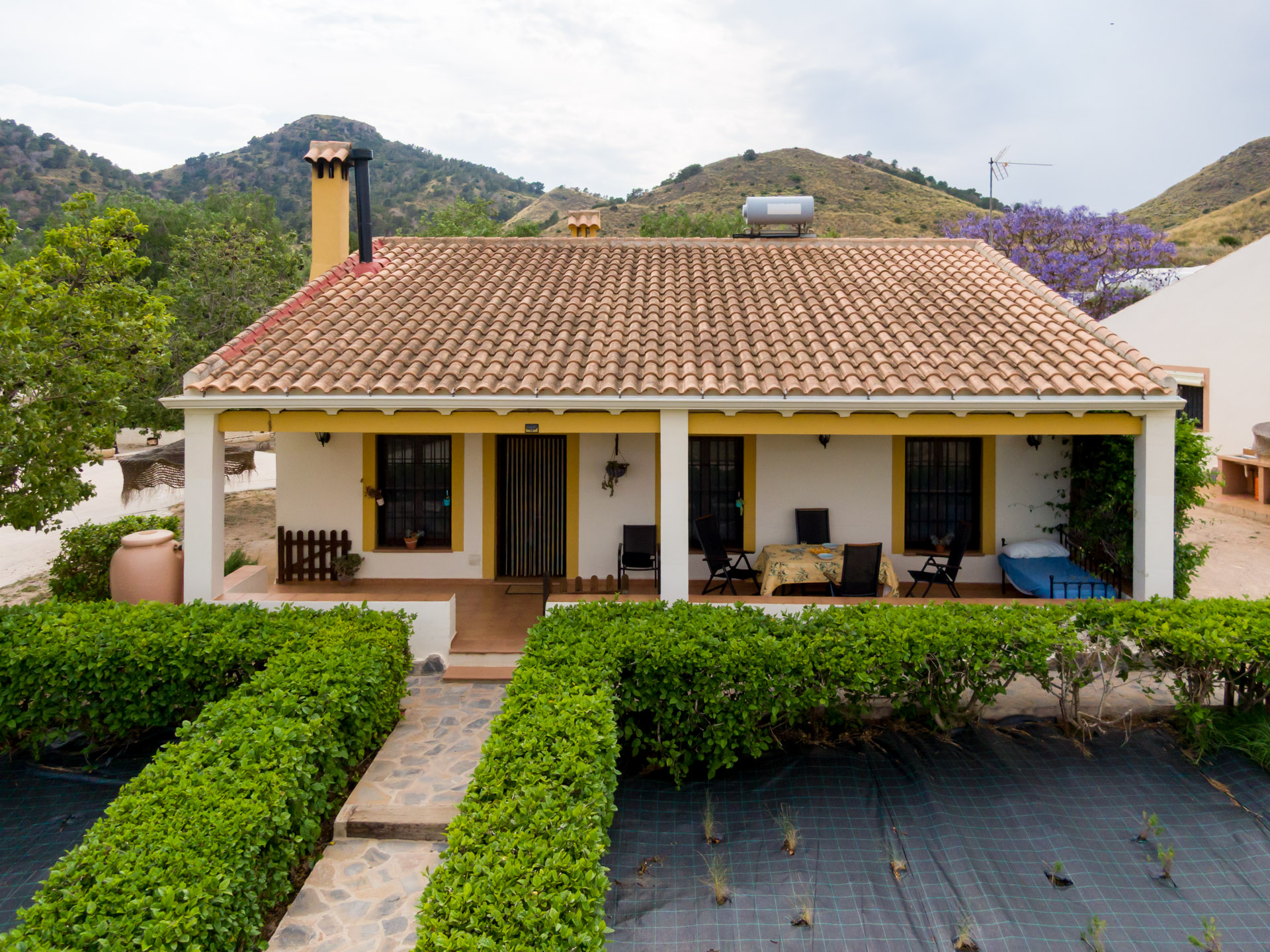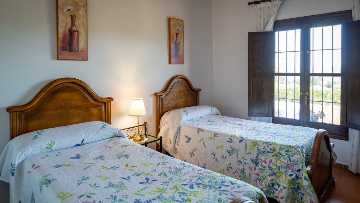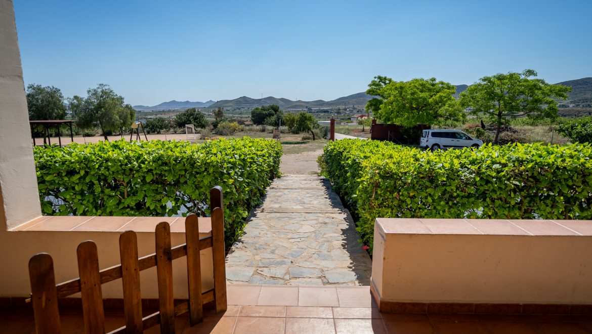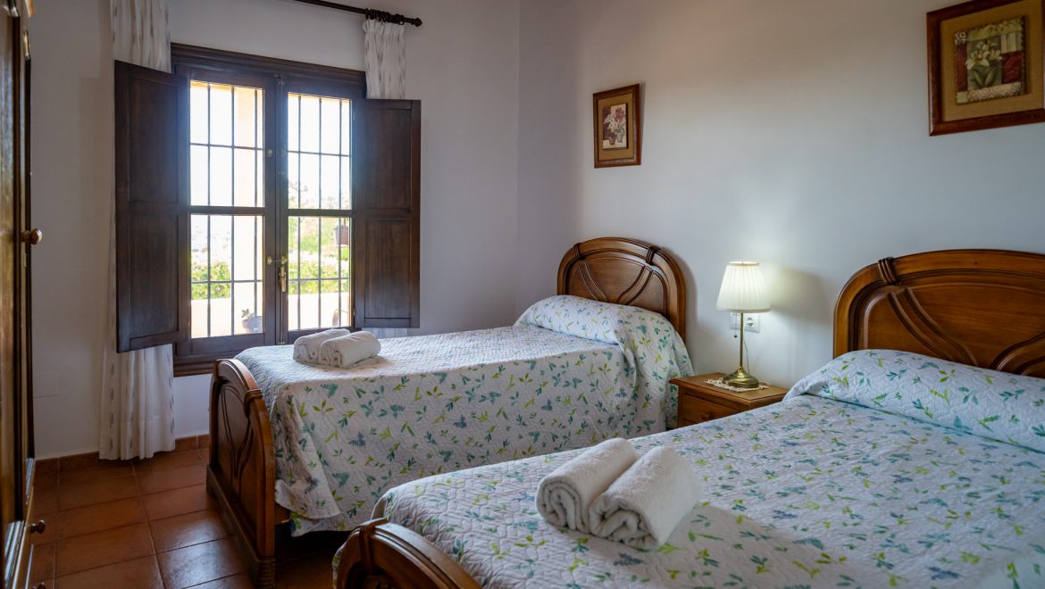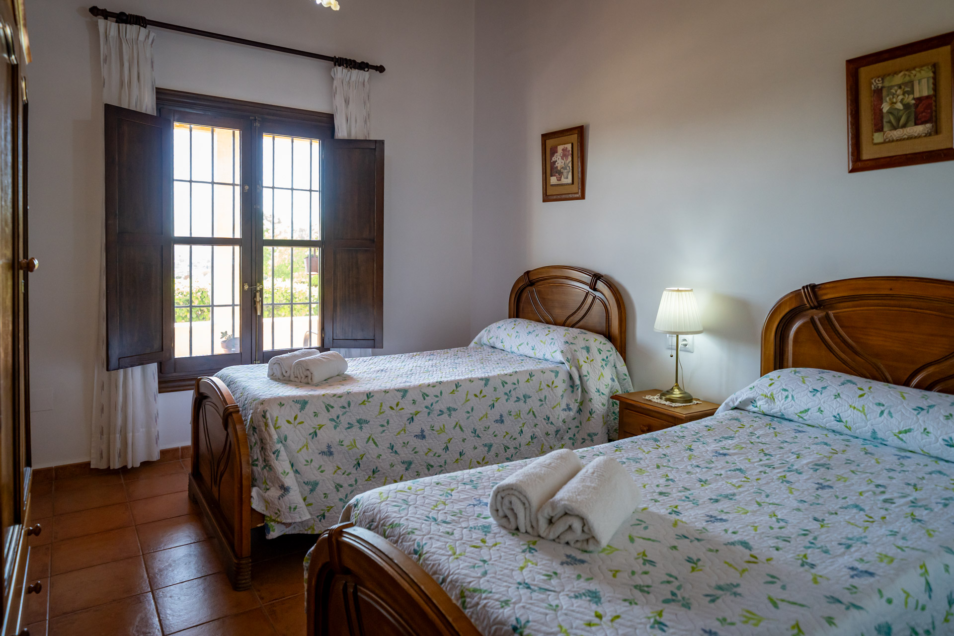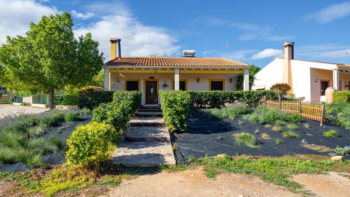 Tiene un amplio salón unido a la cocina, un dormitorio de matrimonio y dos dormitorios dobles con muebles de madera y forja, dos baños con ducha y bañera respectivamente, una terraza cubierta con muebles de jardín y junto a ella una zona ajardinada donde se encuentra la barbacoa. La casa está adaptada para personas con discapacidad.
