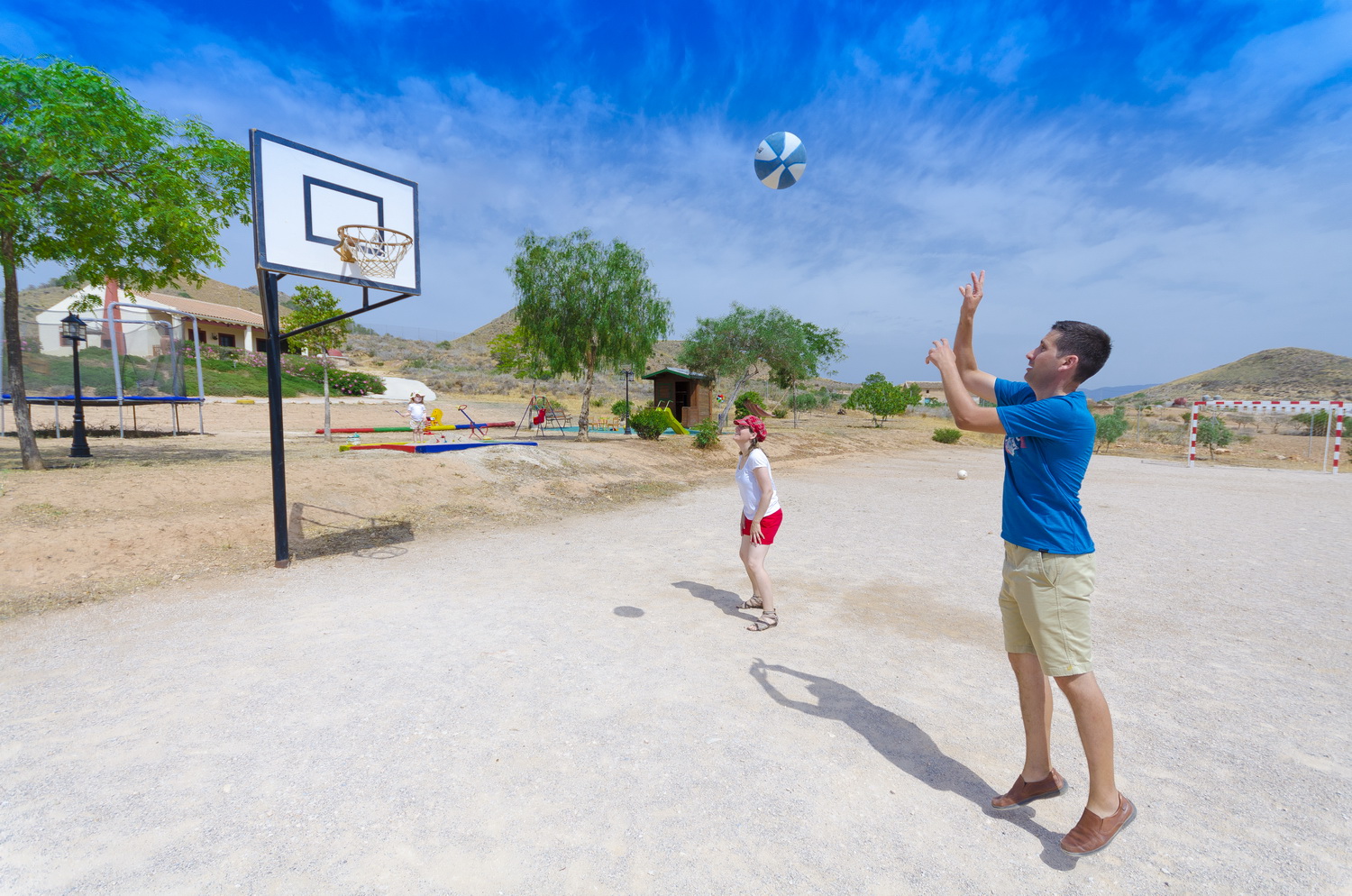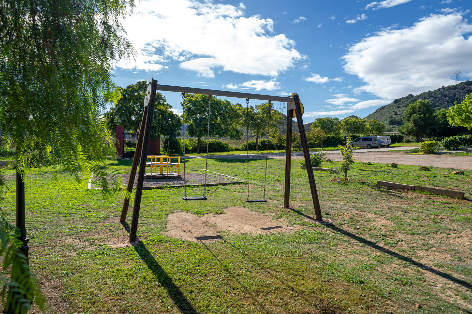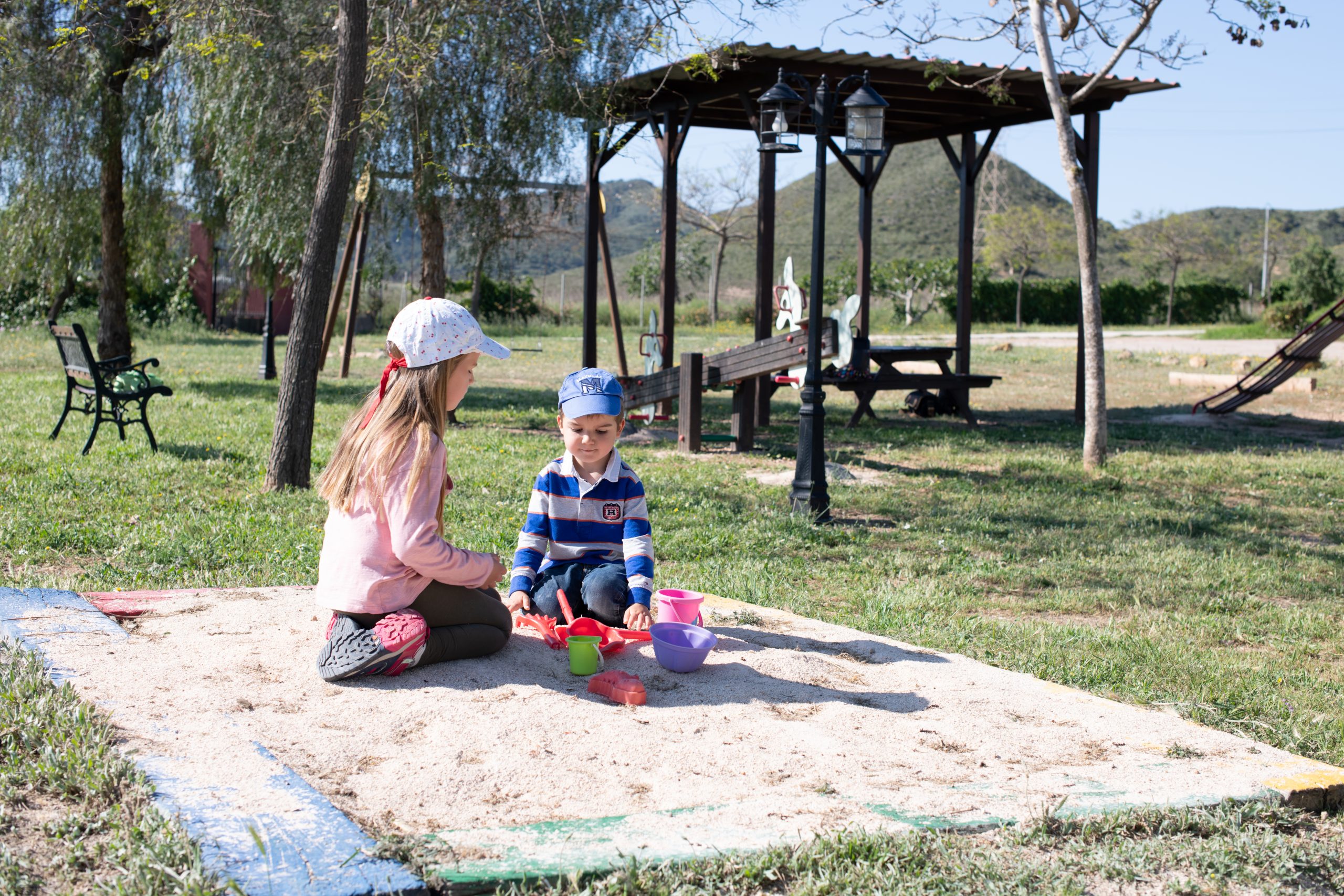 - Zona infantil: Cabaña de madera, columpios, tobogán, arenero y cama elástica.