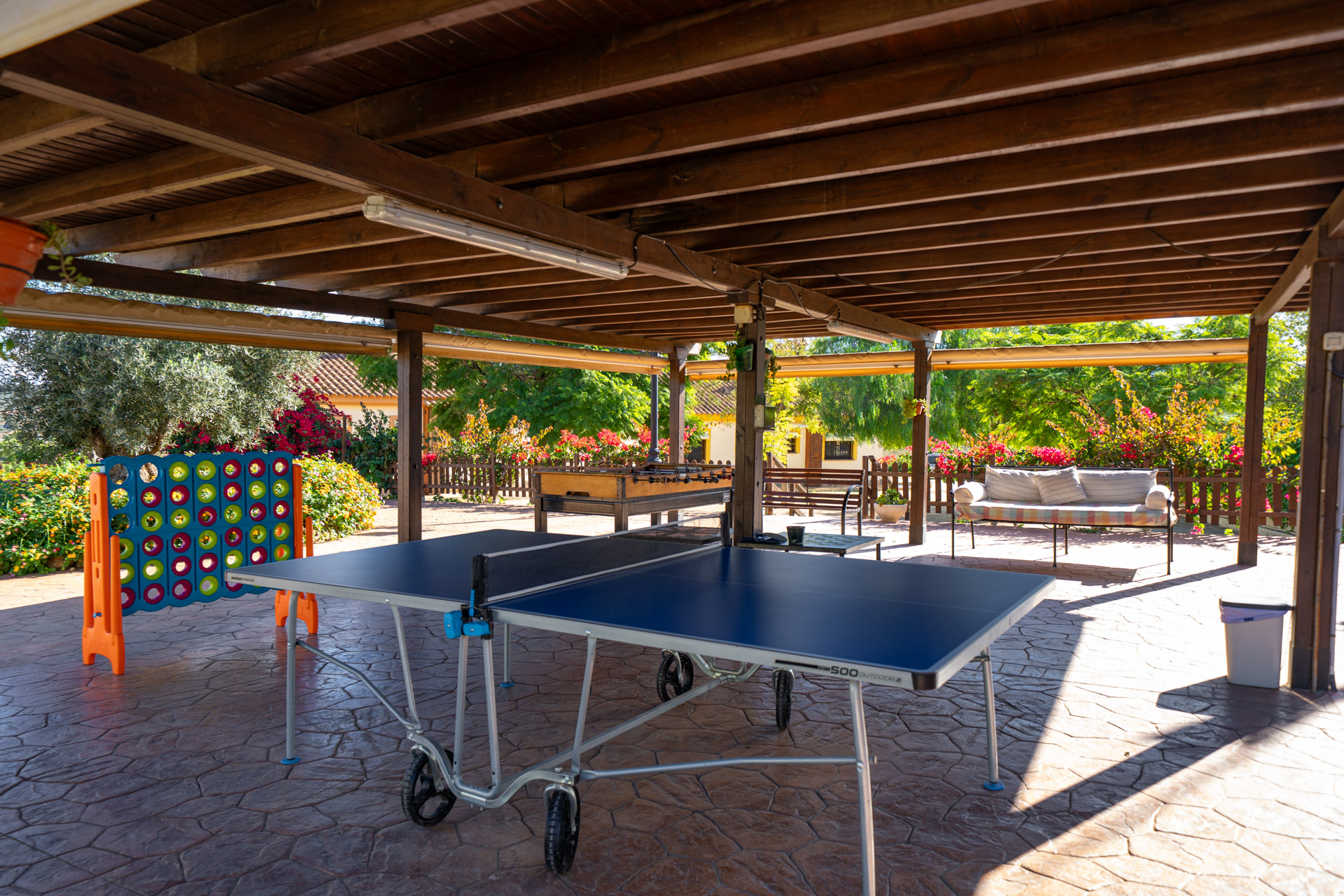 Esta zona de juegos está cubierta por una gran pérgola de madera y en ella hay futbolín, tenis de mesa, un Conecta 4 gigante, ajedrez y tres en raya.