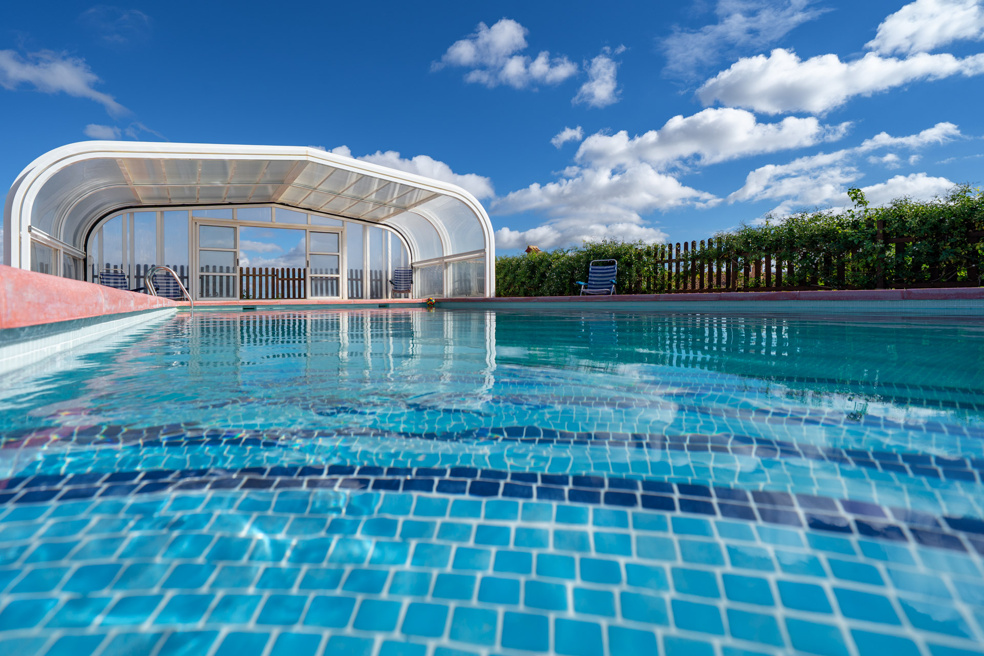 Se puede disfrutar durante todo el año. Tiene una cubierta móvil de más de 2m de altura que produce un efecto invernadero y calienta el agua y el ambiente interior. Además, el agua esta climatizada mediante energía solar y bomba de calor. En verano la cubierta se suele retirar para que la piscina se quede totalmente despejada