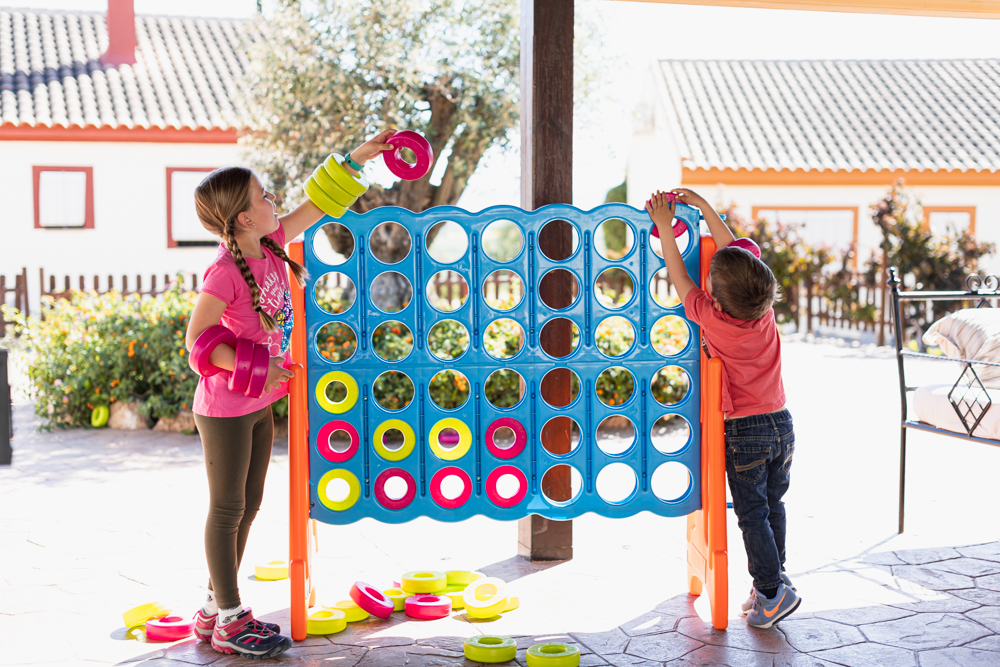 Los niños, además de disfrutar de la piscina, el SPA, los juegos de la pérgola, el campo de fútbol y los animales, tienen su propia zona de juegos, con una cabaña de madera, columpios, tobogán, arenero y una fantástica cama elástica.